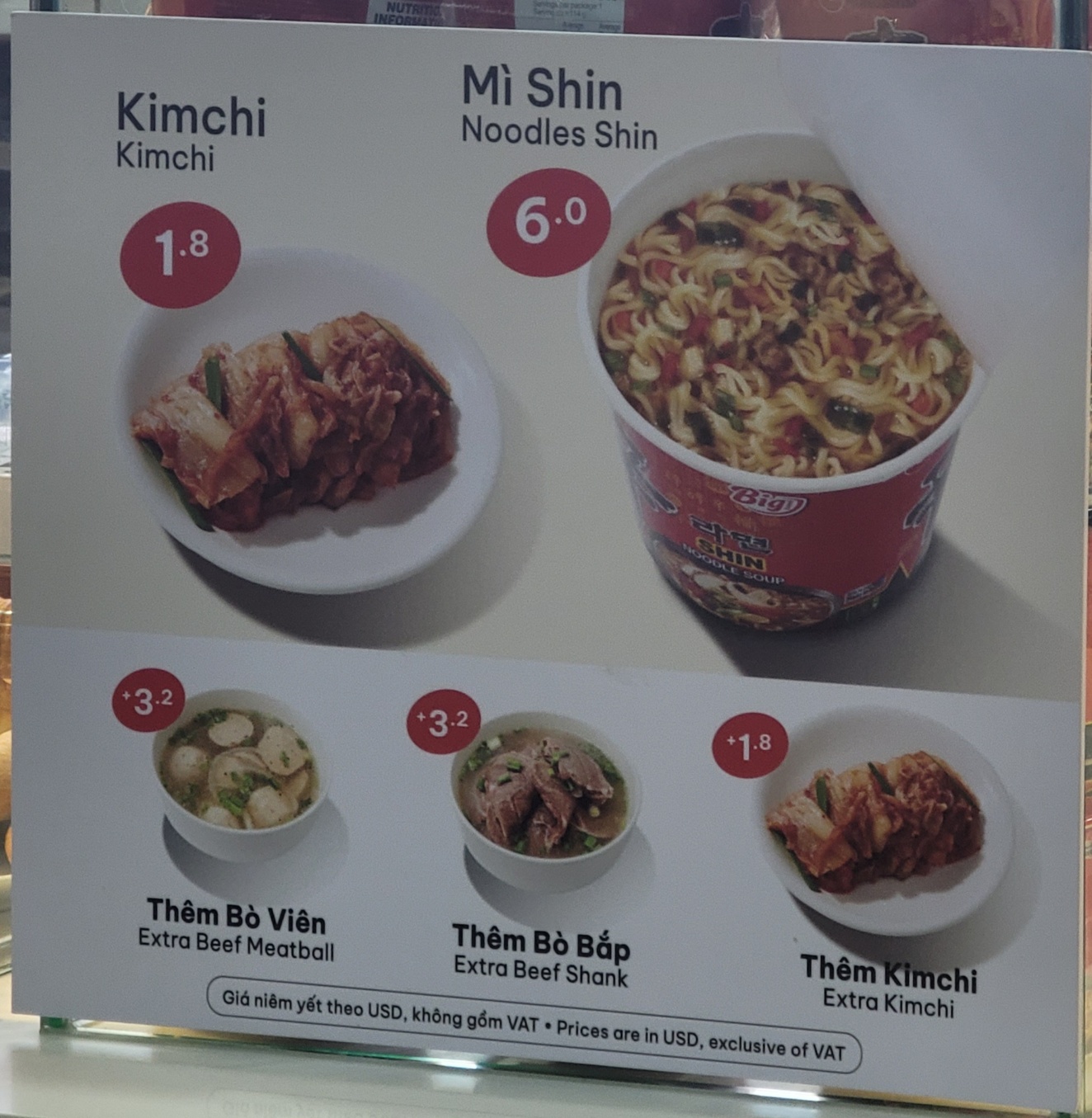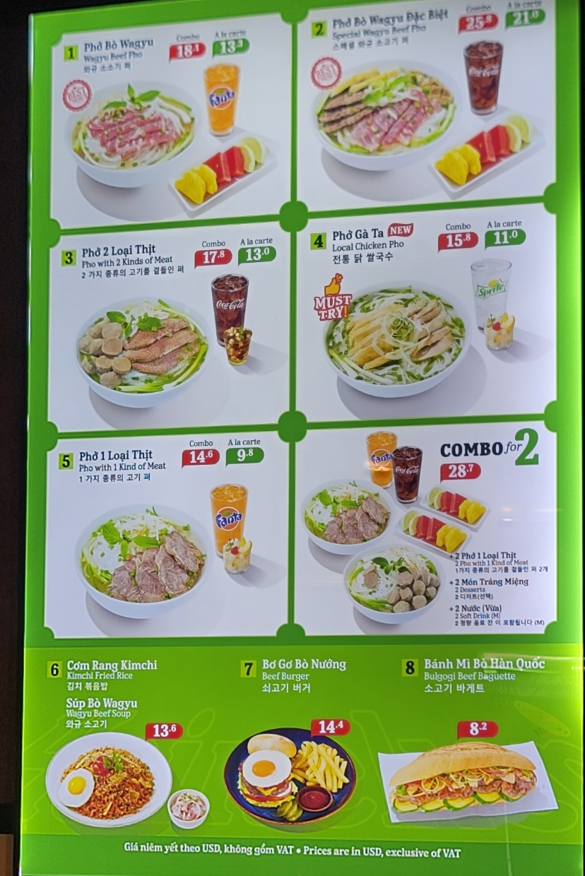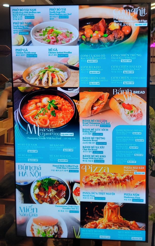 내부식당 가격은 가장 저렴한 쌀국수가 9.8달러로 약 25만동이니 두배 이상이네요!